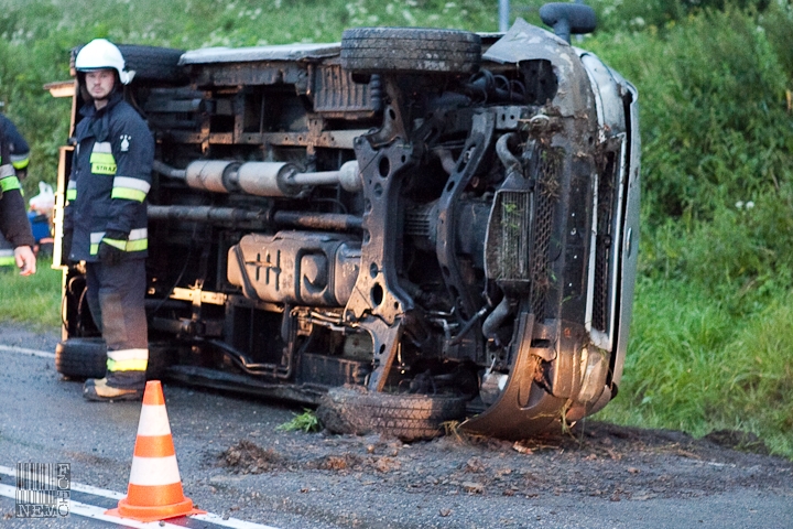Bus marki Ford wypadł z drogi i przewrócił sie na bok. W samochodzie pdróżowało 7 osób, dwie zostały lekko ranne i odwiezione do szpitala. Na miejsce zostało zadysponowanych 7 zastępów straży pożarnych i 4 karetki pogotowia.